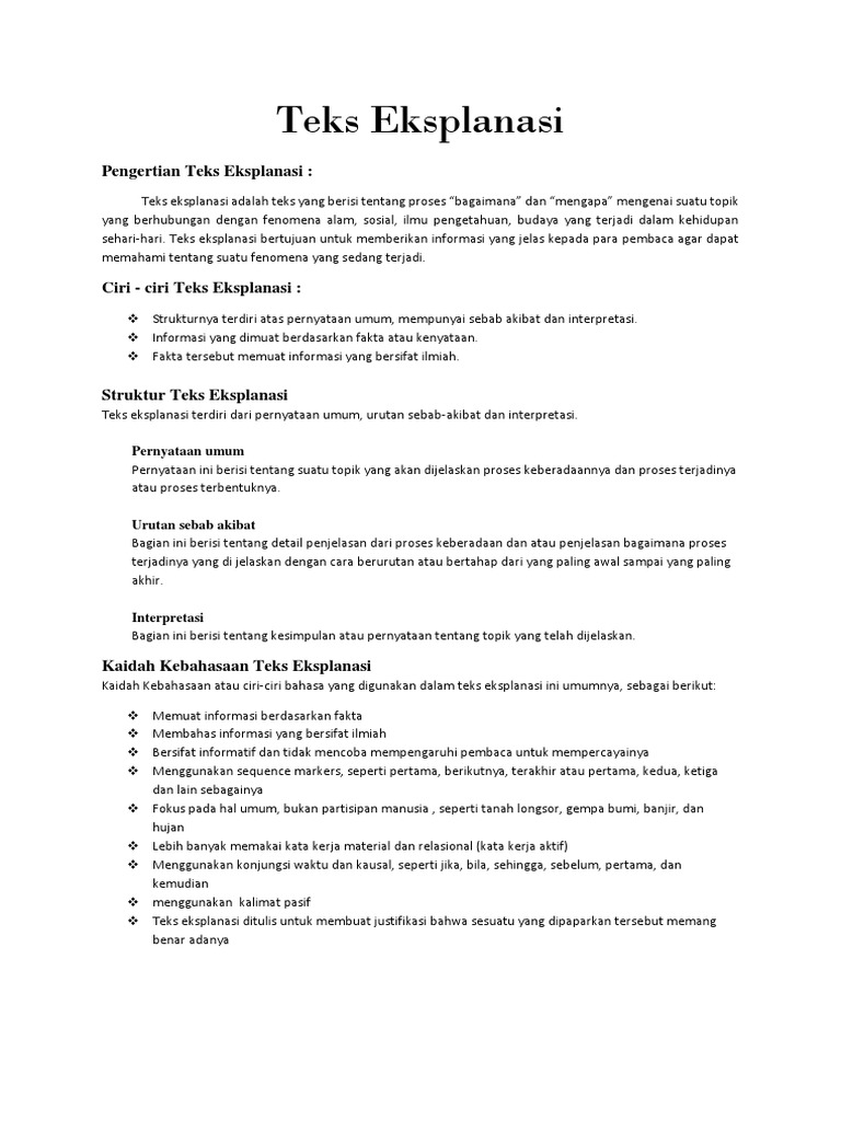 Interpretasi Isi Teks Eksplanasi Kompleks Kosongin from kosongin.com Teks eksplanasi akan banyak dijumpai bila anda memasuki kurikulum oleh karena itu, bagi mahasiswa ataupun pelajar yang ingin mengupas lebih dalam mengenai teks eksplanasi ada baiknya untuk mengetahui. Sebenarnya aspek kebahasaan teks eksplanasi sama saja dengan teks prosedur. Struktur merupakan bagian dari sebuah teks itu sendiri, struktur ini artinya susunan. Apa yang dimaksud dengan teks eksplanasi? Nah agar dapat mengetahui apa saja bagian yang ada didalam struktur teks eksplanasi, marilah kita simak penjabaran dibawah ini beserta dengan hal. Teks eksplanasi merupakan teks yang menjelaskan sebab akibat suatu fenomena, baik itu teks eksplanasi tersusun atas suatu struktur yang memudahkan kita dalam memahami isi teks. Teks eksplanasi merupakan teks yang menjelaskan. Dibawah ini merupakan tujuan dari teks eksplanasi diantaranya sebagai berikut ::