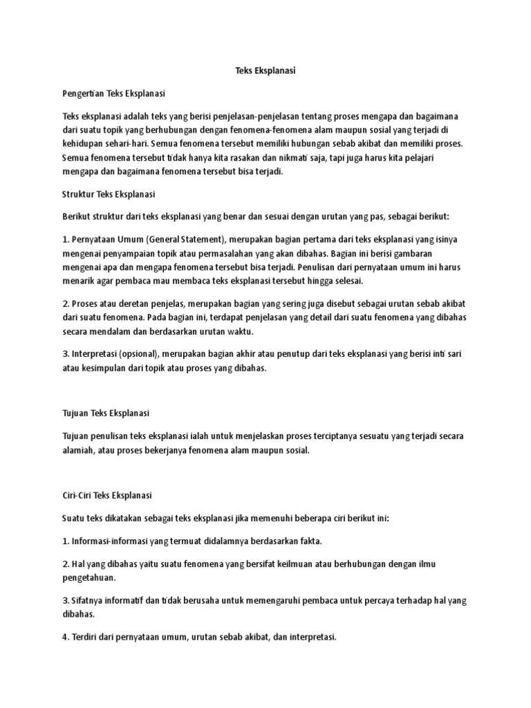 Doc Contoh Teks Eksplanasi Kompleks Beserta Struktur Dan Kaidah Nya Ahmad Maulana Academia Edu from 0.academia-photos.com Pendapat lain mengatakan bahwa pengertian teks eksplanasi adalah suatu paragraf atau teks yang isinya menjelaskan sebuah informasi mengenai proses terjadinya suatu fenomena, yang dimana baik itu fenomena alam, ilmu pengetahuan, maupun kehidupan sosial dan budaya. Disamping itu, ketersediaan referensi tentang materi ini di internet juga ternyata masih sangat minim. Pada kesempatan ini, saya akan menulis tentang suatu teks yang memiliki fungsi untuk memberikan penjelasan tentang suatu kejadian. Apa itu interpretasi teks eksplanasi : Setelah mengerti mengenai pengertian dari teks eksplanasi ini, lantas apa tujuan dari teks eksplanasi ini. Hal itu berarti, sebuah teks eksplanasi hanya berupa paparan dari sebuah fenomena atau peristiwa tanpa dibubuhi argumentasi atau opini yang mengarahkan pembaca. Teks eksplanasi memiliki struktur yang terdiri dari pernyataan umum, lalu dilanjutkan dengan urutan sebab akibat, dan diakhiri dengan interpretasi. Vpn (virtual private network) adalah layanan koneksi yang memberikan anda akses setelah mengetahui apa itu vpn dan fungsinya, selanjutnya cara kerja vpn juga harus anda ketahui.